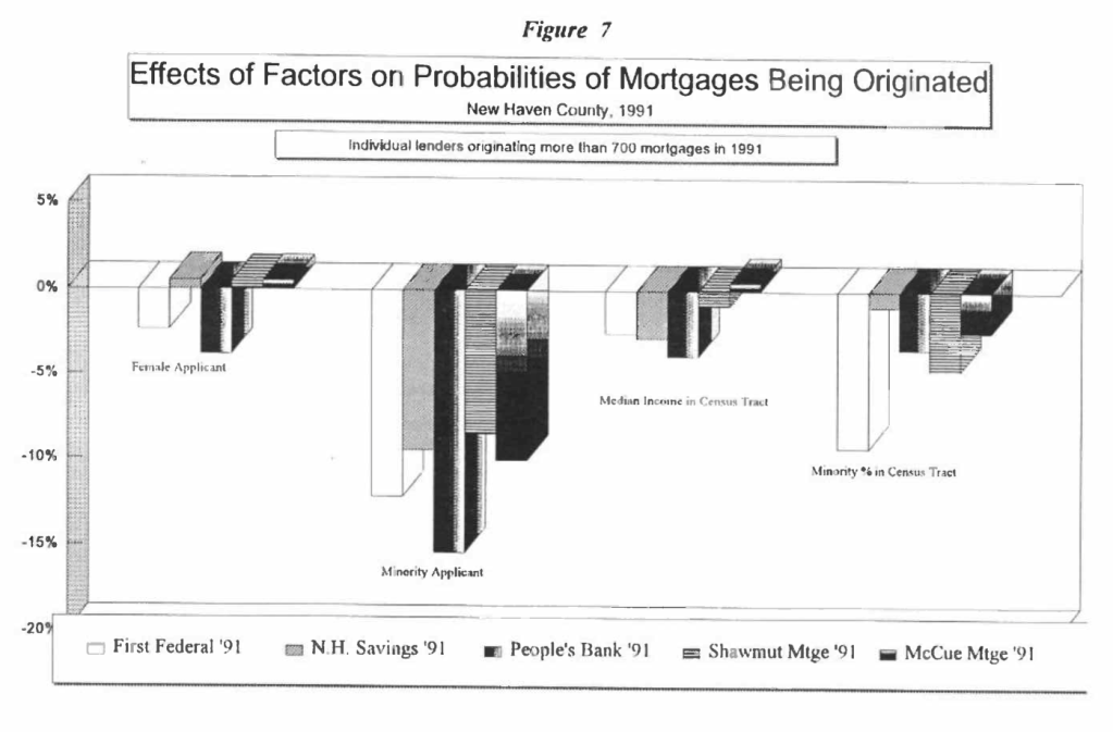 The Federal Reserve Bank of Boston study[15] overcame these problems. Using the Fed’s position as a bank regulator, the writers were able to gain cooperation of lenders. They got access to all loan applications filed in the Greater Boston area in 1990. After evaluating this information, the study was able to conclude that minority applicants are indeed generally less credit worthy. However, the differences in credit worthiness did not fully explain discrepancies between the loan rejection rates for white and minority applicants. To the extent that the characteristics of credit worthiness for minority mortgage applicants in the Greater Boston Area are applicable to minority mortgage applicants elsewhere, inference can be drawn about how wide a discrepancy in loan rejection rates between white applicants and minority applicants is consistent with non-discriminatory behavior.